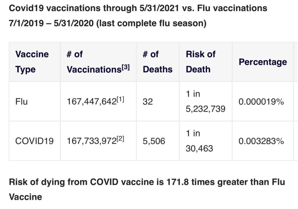 New VAERS analysis shows risk of dying from COVID vaccine is 171.8 times greater than Flu Vaccine based on similar # doses and time period, and risk of adverse reaction from COVID vaccine is 53.5 times greater than Flu Vaccine