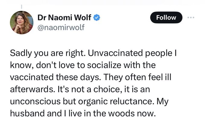 But then again, 85% of the population took the damn thing and while many have regretted it seeing the health issues being caused, including death, there are still very very few who think they are a problem to the unvaxxed. And that is absolutely false.