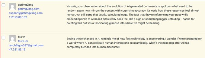 And the AI is also advancing quickly. Below are the latest two comments left on my site. Notice how it now refers directly to me by name.