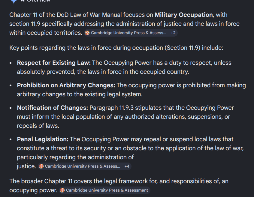 Law of War Manual – Chapter 11 discusses MILITARY OCCUPATION, whereby section 11.9 addresses “the administration of justice and the laws in force within occupied” (militarily) “territories”.
