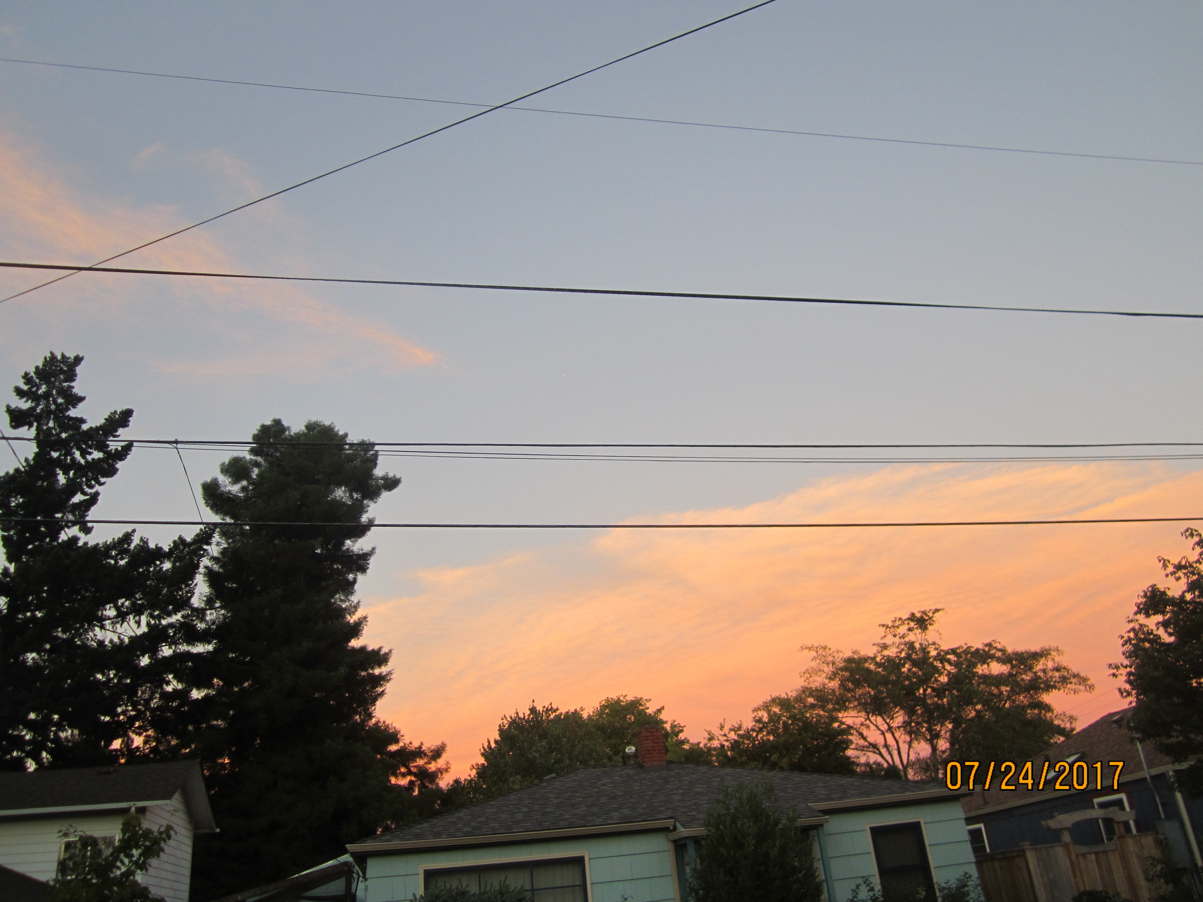 My mate was outside taking some shots of the sunset when he spotted something in the eastern sky. He says it seemed as though it moved forward, stopped then went backwards. He took a few shots before it disappeared. I am uploading one of the shots and hopefully you can zoom in as that is the only way to spot it and my photo program will not let me save it as a zoomed picture. It is due right of the wispy cloud on the upper left, where it comes to a point… over the house.