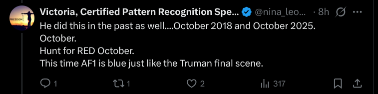 I was then asked if I knew the number of days between the incident in October 2018 and today, and October 25, 2025, and today. I did not, but said I would get on it later, which I did. Check out these results and how the last one especially aligns with what Dan Scavino Jr has been sharing: 1) Steve Miller, Fly Like An Eagle and the tweet he shared earlier this evening showing an Eagle slowly moving its head, eyes looking straight into the camera.