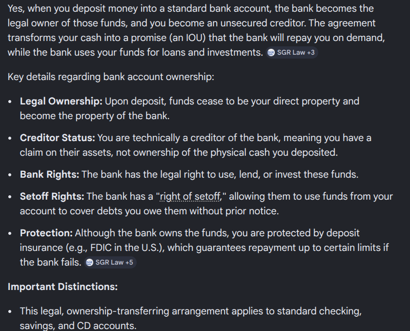 And here’s something most of us don’t know. The bank is the legal owner of all funds deposited into your account.