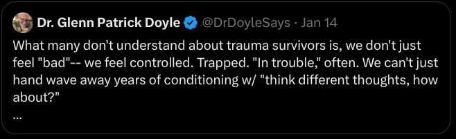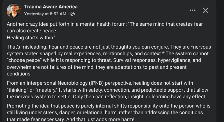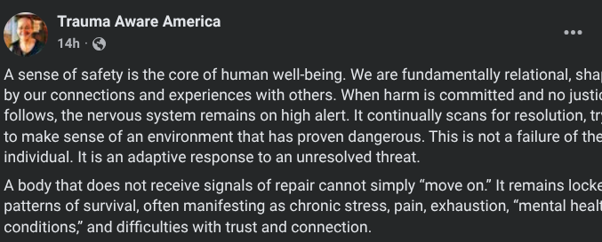 The deepest, most authentic healing starts with the body and must include an environment of safety. That is how we build trust again. I had a deeply violating experience yesterday with a system employee that shook me to my core for a few moments. This is someone who knows my personal issue and decided to challenge me (when she is supposed to be helping me) by asking me a completely unprofessional, violating question (and she knew what my answer would be – she was trying to provoke me to get me to see her perspective). My counselor even said it was a grossly insensitive, highly inappropriate thing to ask. Not sure what I will do about it ATM. …. It’s simple. SAFETY first. If this cannot be provided, especially if one is an employee of the system, they need to find a different line of work. Have had this happen too many times with “professionals”. Fancy letters after a person’s name do not indicate they still carry the “H” for humanity in their hearts.