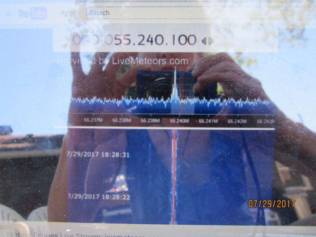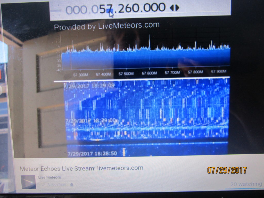 Outside enjoying the nice day earlier when something said “go to live meteors”.  Took some shots.  There was a continuous red line band streaming for minutes.  The frequency at that time was 51.260 hz.  Then they changed it two times to 55.260 to 57.260.  This happened within moments.  I captured the very strange image at 57.260 hz.  Never seen this one before.  In the live chat one of the folks said “wth is that??!”  No one had an answer other than an interference of some sort.  (pardon the visual of yours truly – sun reflection – which is why the next shot was taken in the garage.)