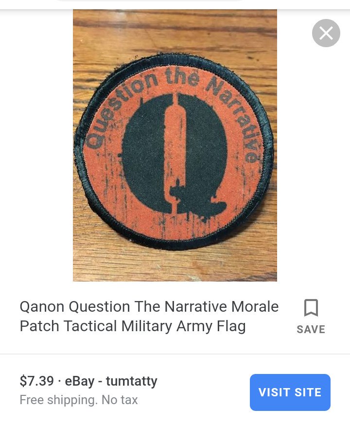 editor victoria’s comment ~ at first i was suspicious of this one – that “Q” could be something other than Qanon.  however someone found the following image on e-bay – it appears to match the patch the officer is wearing.