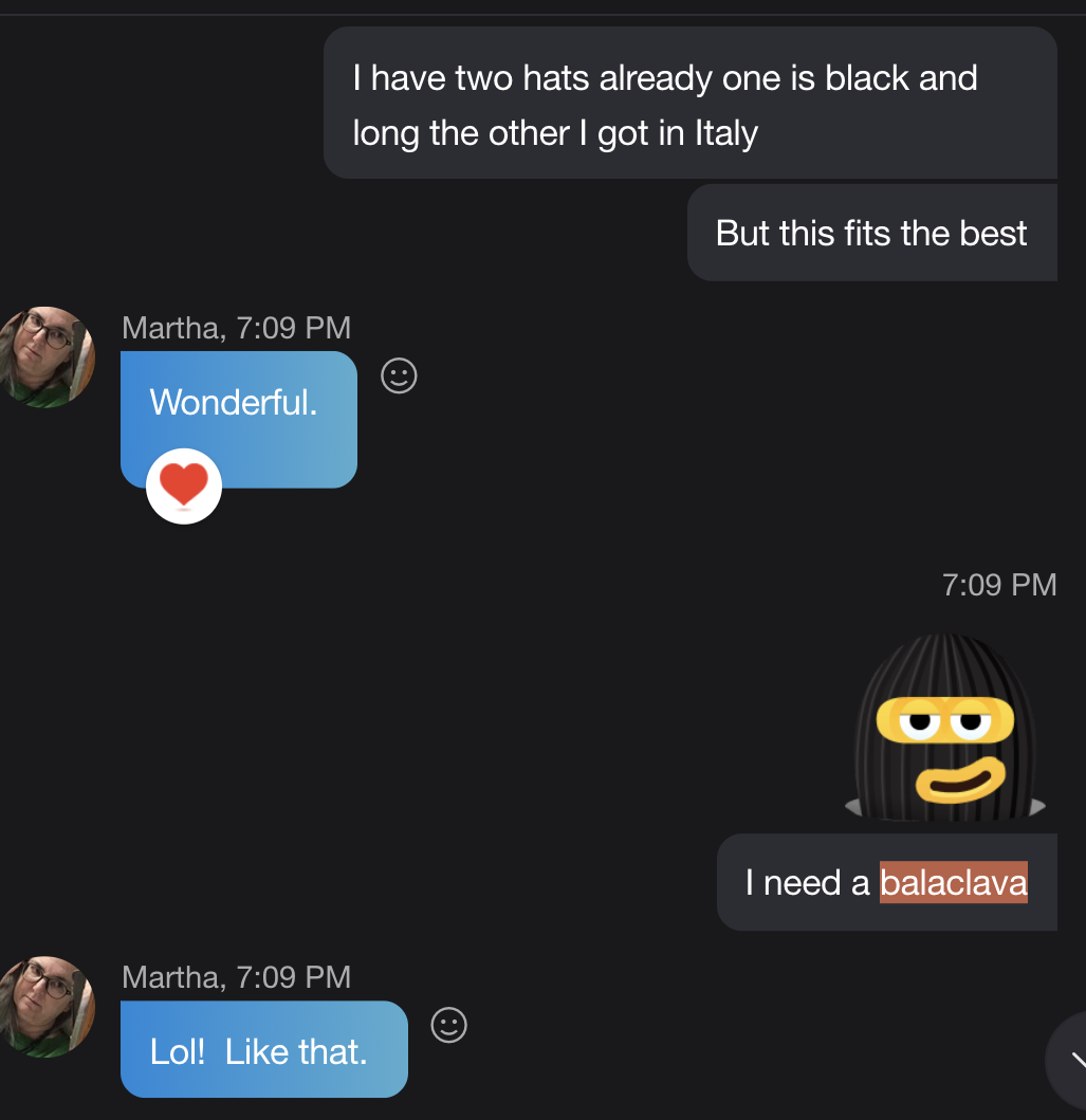 Nabrac again: and you know that balaclava you mentioned could be useful??? Well… I wonder why that ‘thought’ came in.. huh??? Could be useful in ‘undercover’ work…. ? 😃Â