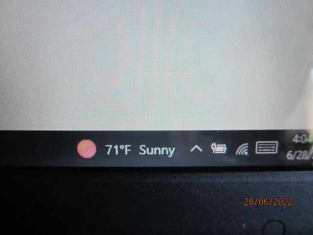 Looking at my computer – bottom right I always have a line of icons showing battery power, time, date, etc. The icon for the weather is the Sun (because it’s sunny out) only today? The sun isn’t yellow like it always is – it’s a pinkish color. BIZARRE. Pic below. NEVER been this color before. And there are two whitish craters too – looking more like the moon than the sun: