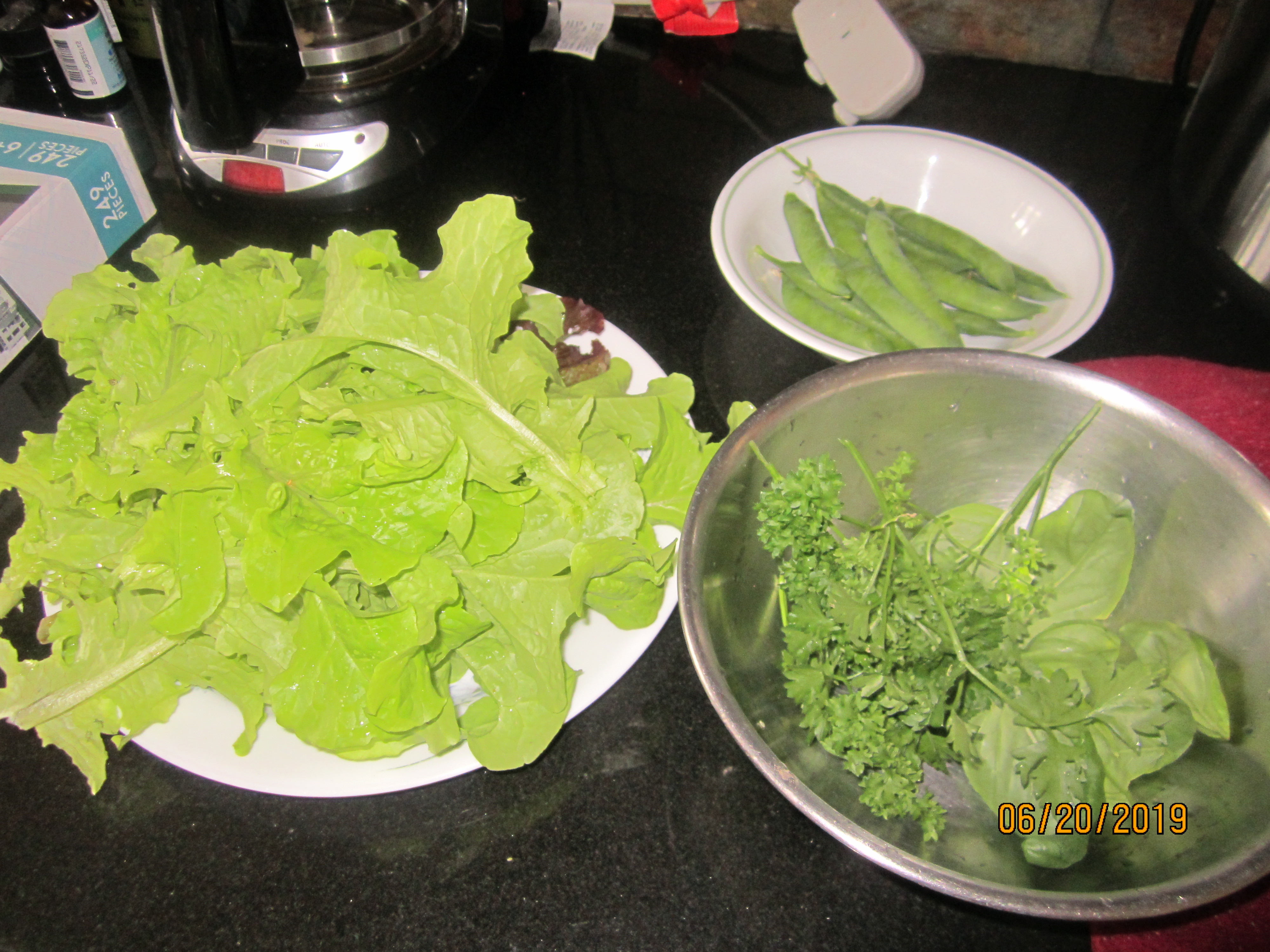 leaving you here with something beautiful ~ garden harvest from a few days ago..;.mixed lettuce, snap peas, parsley and basil (all been consumed)….