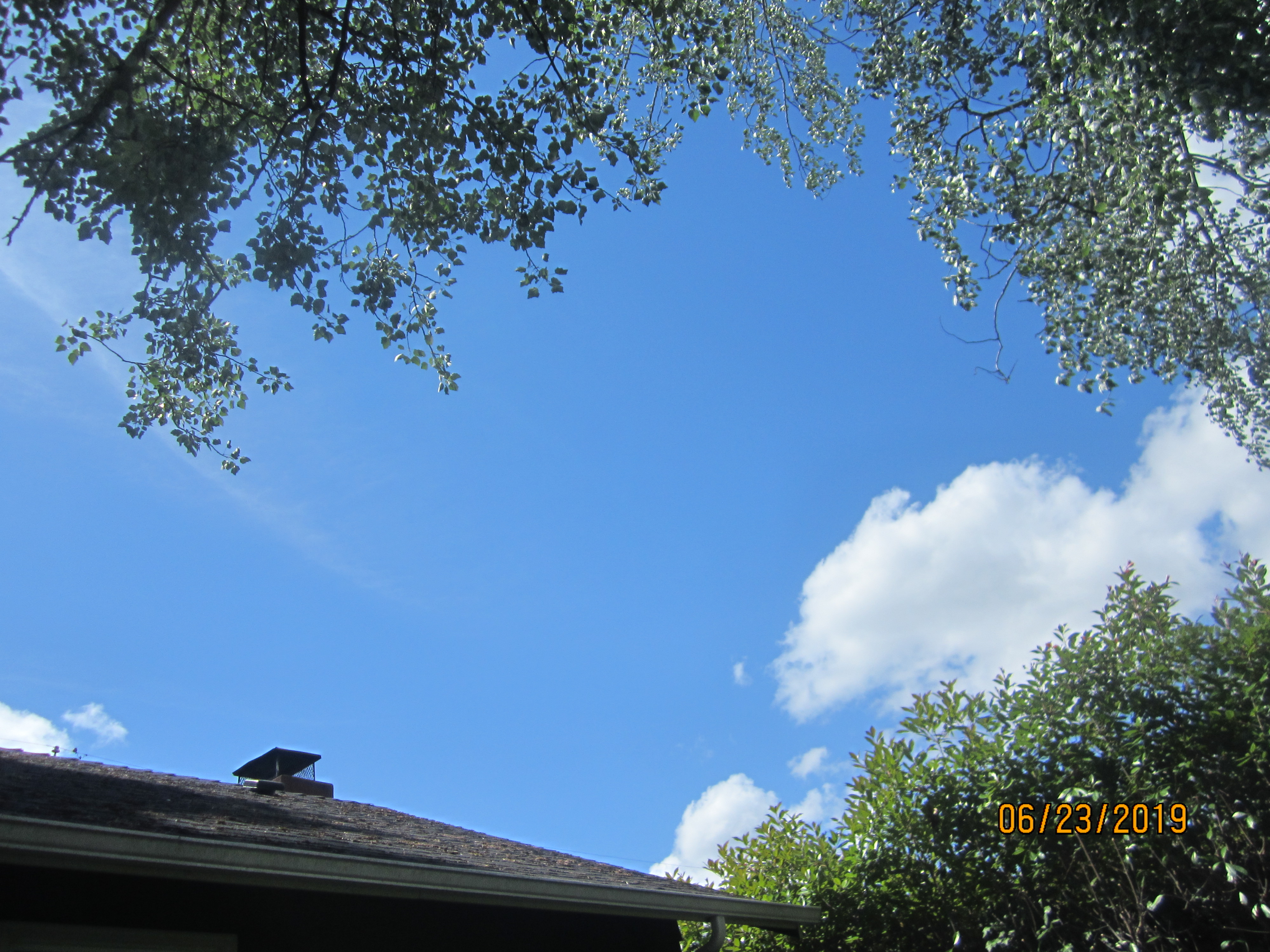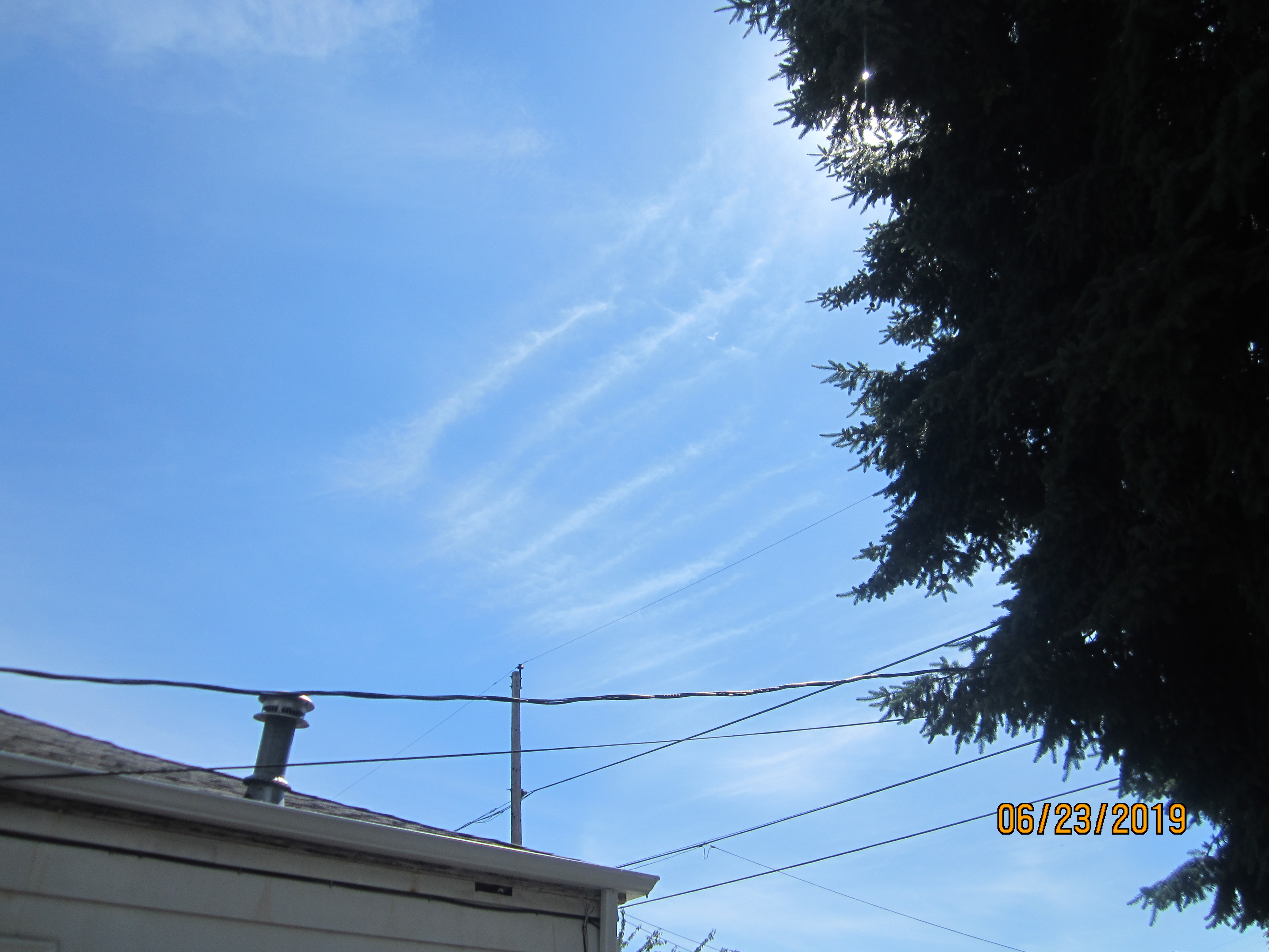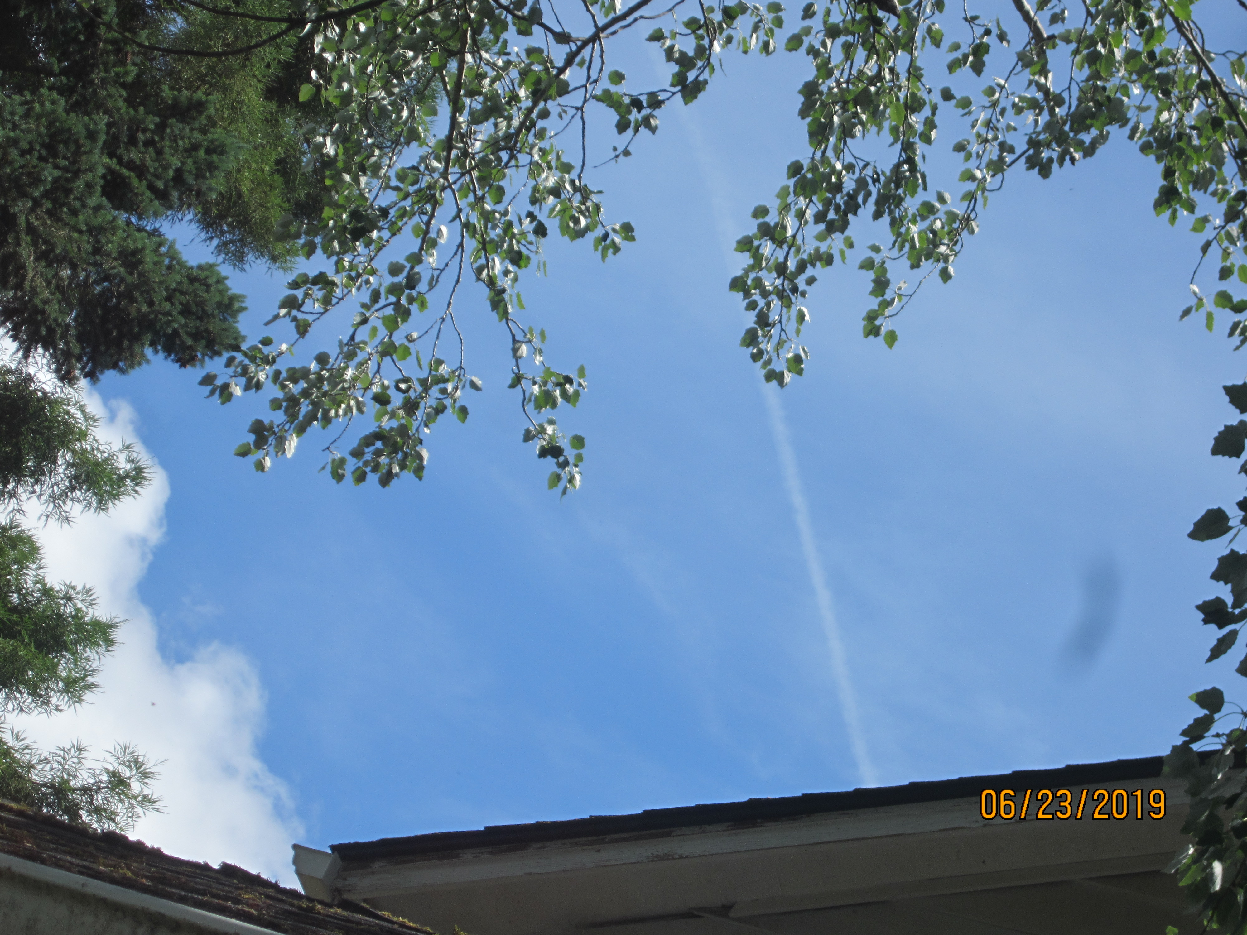 outside earlier today – took these captures……..you will see the clear difference between the blue sky to the NNW and the chem sky to the SSE….and i saw a first today – a trail that did not widen as they normally do….instead it stayed narrow and as it drifted to the east it dispersed the “chemical concoction of sheot” as it went – leaving the skies hazy white (as you will also see below)……then there was the odd pattern too – not sure if that was from this particular trail or the ones that had been laid to the west….